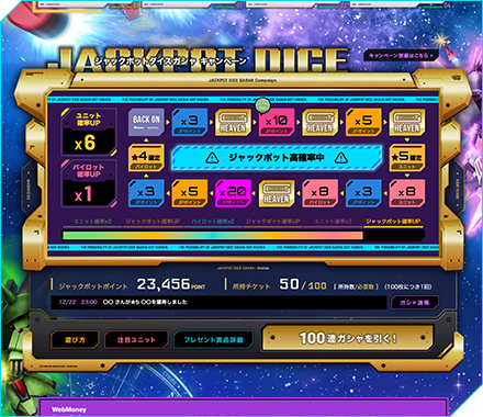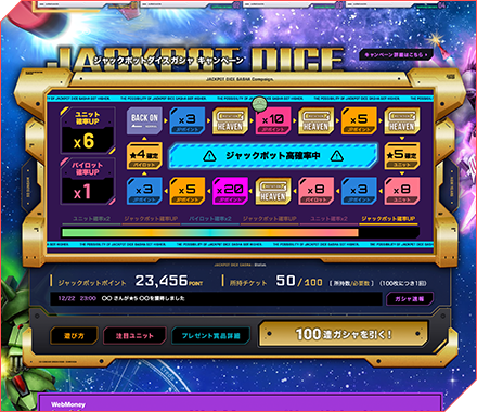 ・『ジャックポットダイスガシャ』で排出されるものには、ゲーム内カード(ユニット、パイロット、強化用カード)、賞品つきハロ、ゲーム内アイテム賞品の3種類がございます。