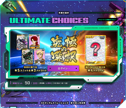 ※「ジャックポットダイスガシャチケット」「究極の選択チケット」「人気投票チケット」はSDガンダムオペレーションズをプレイすることで入手できます。詳細はゲーム公式サイトのお知らせをご確認ください。